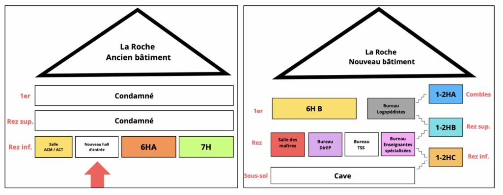 À l’issue des vacances de Noël, soit dès le 05.01.2026, l’ensemble des classes actuellement scolarisées à La Roche déménageront dans les nouvelles salles de classe. Vous trouverez ci-dessous un schéma simplifié présentant les deux bâtiments ainsi que la répartition des classes pour la deuxième partie de l’année scolaire.