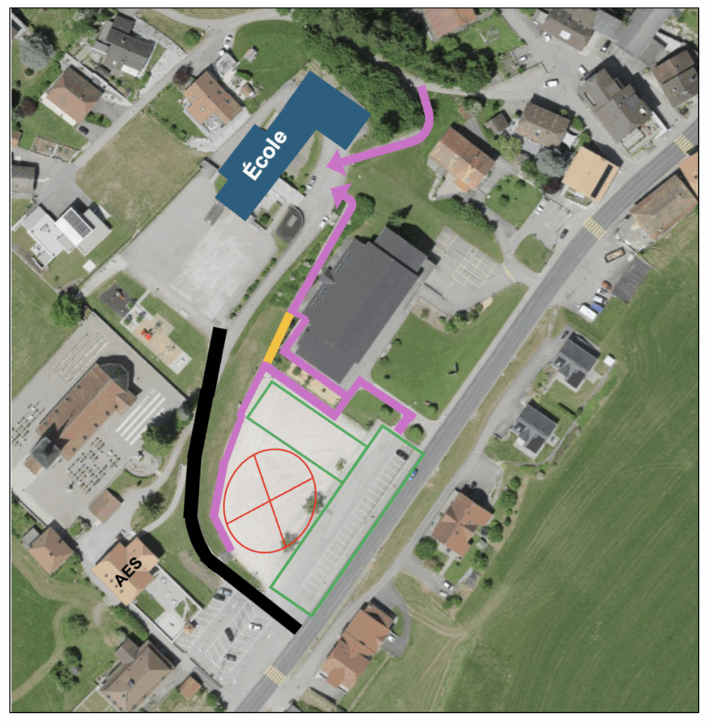 Pour cette raison, nous vous recommandons d’éviter l’utilisation du parking goudronné situé devant l’AES, en particulier pour les enfants déposés en voiture, dans la mesure où ceux-ci devront ensuite descendre jusqu’à la halle de gym afin d’accéder à l’école.