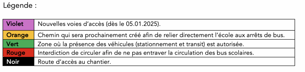 Par ailleurs, nous vous présentons ci-dessous les nouveaux chemins d’accès à emprunter dès le 05.01.2026 pour se rendre à l’école de La Roche, que ce soit dans le nouveau bâtiment ou dans l’ancienne bâtisse. Ces nouvelles voies d’accès permettent d’éviter la traversée du chemin menant au chantier. Tous les élèves, y compris celles et ceux utilisant le bus scolaire, pourront désormais passer le long de la halle de gym pour rejoindre l’école.